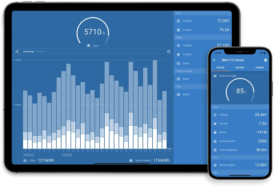 Configureer, bewaak en diagnosticeer snel slimme producten met de VictronConnect-app. Met de afstandsbedieningsfunctie kunt u verbinding maken met uw GX-geactiveerde systeem, ongeacht waar u zich bevindt, zodat u de prestaties kunt optimaliseren en problemen op afstand kunt voorkomen.